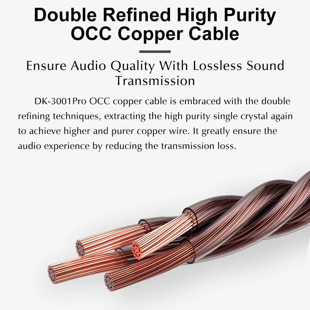 DK-3001 Pro OCC copper cable is embraced with the double refining techniques, extracting the high purity single crystal again to achieve higher and purer copper wire. It greatly ensure the audio experience by reducing the transmission loss.